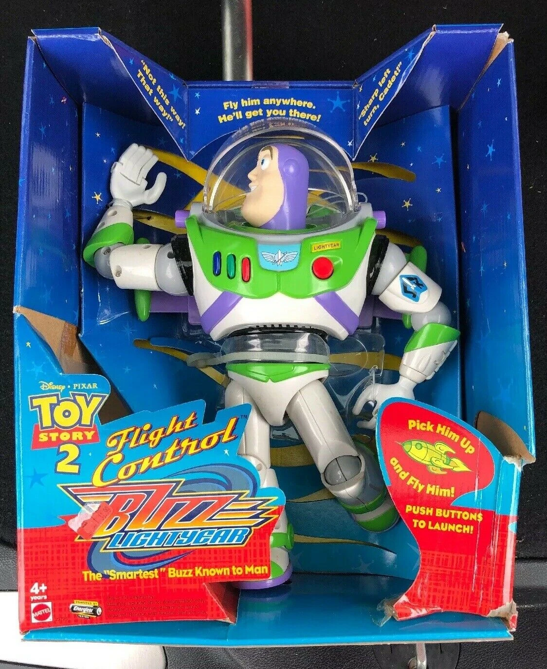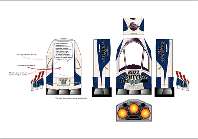 Buzz comes packaged in an ornately detailed box designed after a spaceship. It features the Buzz Lightyear logo proudly displayed on the front, and two cardboard wings located on either side. Buzz can be seen through a transparent plastic sheet on the "Cockpit", and, as seen in Toy Story 2, the box opens from the bottom, through which a secondary cardboard tray is removed. Buzz is attached with four total twist ties at the wrists and ankles. Buzz is completely inaccessible without opening the package, which brings to mind the question of why the figure has a demo mode at all.