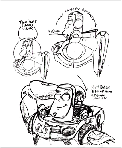 Buzz's helmet is fully retractable using both of the purple buttons located on the right side of his helmet. It even includes a tab on top of the front dome, although a concept art[7] shows that the tab's purpose is to pull the helmet back into it's original position while it's shown in the final version that it can be retracted back by pushing the button again (it's not confirmed if this is the movie-magic Buzz's alive-mode has or if the user has to do this manually when the figure is in toy-mode). This causes both halves to swing down into the torso, leaving only about an inch of each exposed on the backside of his suit. It's unknown how the mechanism of Buzz's helmet actually works.