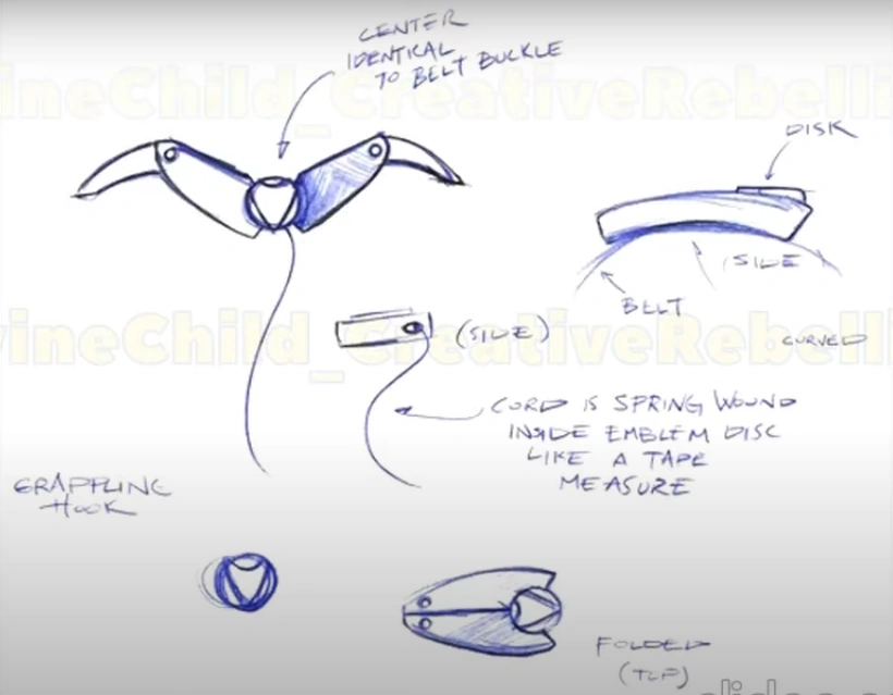 A folding grappling hook with a zip rope is stored in the back compartment of the belt which can also be held by another person, the grips contain retractable spikes.